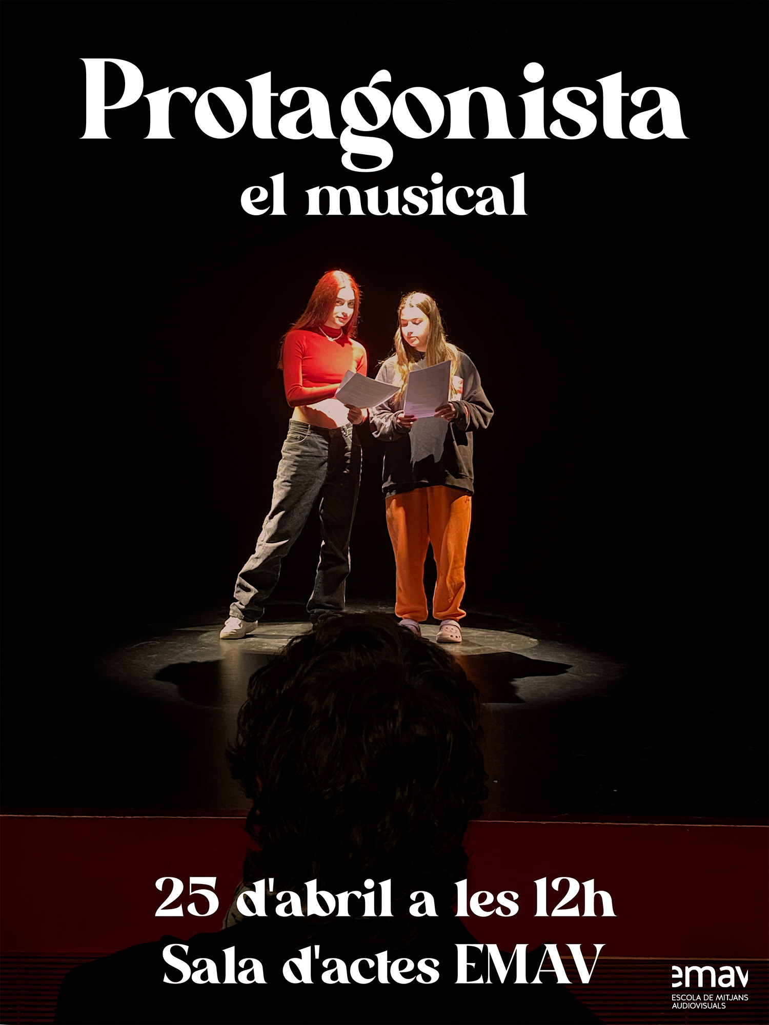 Des del passat mes de febrer, alumnat de diferents cicles de l’EMAV (producció, realització i so) han estat preparant una obra de teatre musical com a projecte final de cicle. L’estrena serà el proper dijous 25 d’Abril de 2024 a la sala d’actes de l’escola, començarà a les 12:00h i tindrà uns 30 minuts de durada. Reserva la teva entrada!